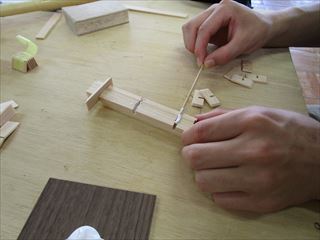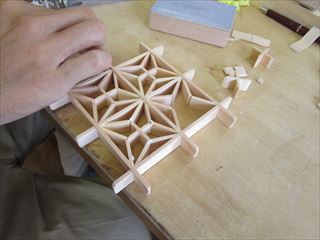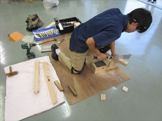 外部提携として、碧南市の㈱指只の鈴木様をお招きし、建具についてのお話を伺った後、組子細工のコースター製作を体験しました。生徒たちが真剣に取り組み、楽しみながら学ぶ姿が印象的でした。卒業生2名も講師として参加してくれました。