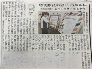 8月13日~17日に行われる『知覧特攻平和会館パネル展』のパネル設置の様子が中日新聞 西三河版に掲載されました。
